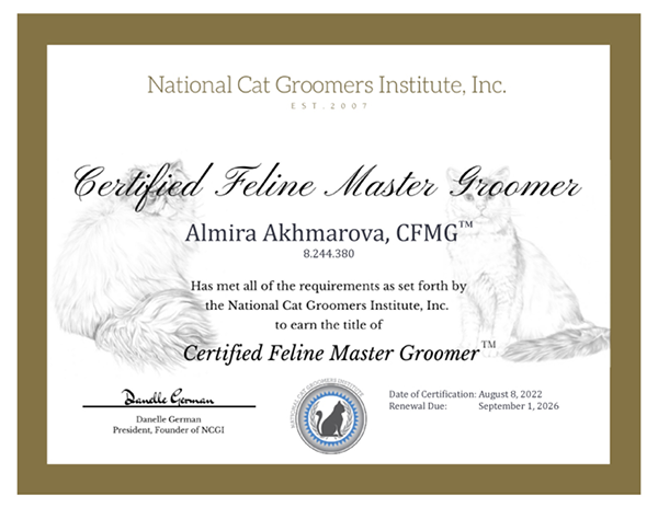 Choosing a Certified Feline Master Groomer means choosing expertise, compassion, and peace of mind. Your cat is in experienced, educated hands — and treated with the respect and care they deserve.