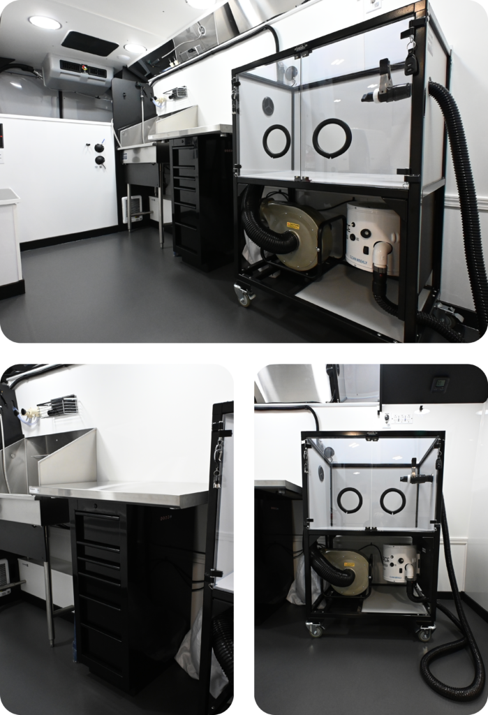 Inside, the van is built exclusively for cats. It features a custom stainless steel cat tub, a cat exclusive grooming table, and a Catty Shack Vac, a gentle system that collects loose fur as we groom. This keeps grooming calm, reduces stress, and helps prevent shedding and hairballs.